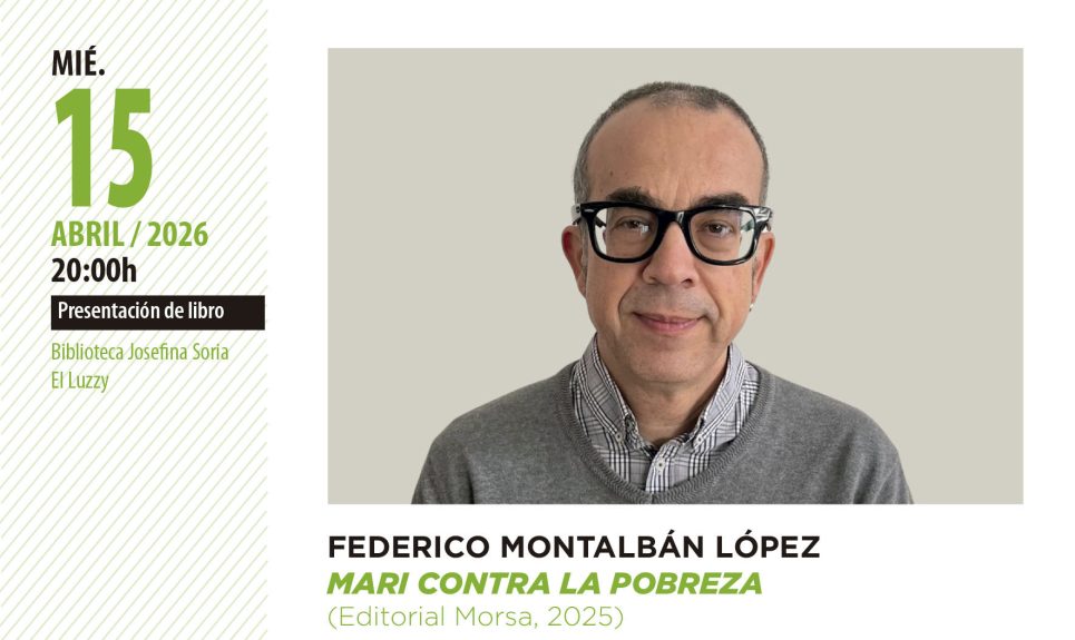 Miércoles 15 de Abril a las 20:00 horas Presentación de libro Biblioteca Josefina Soria, El Luzzy FEDERICO MONTALBÁN LÓPEZ MARI CONTRA LA POBREZA (Editorial Morsa, 2025) Mari vive en un barrio cualquiera de la Región de Murcia, trabaja de camarera, tiene dos hijos (Jaime y Jorge) y un dinosaurio. El…
