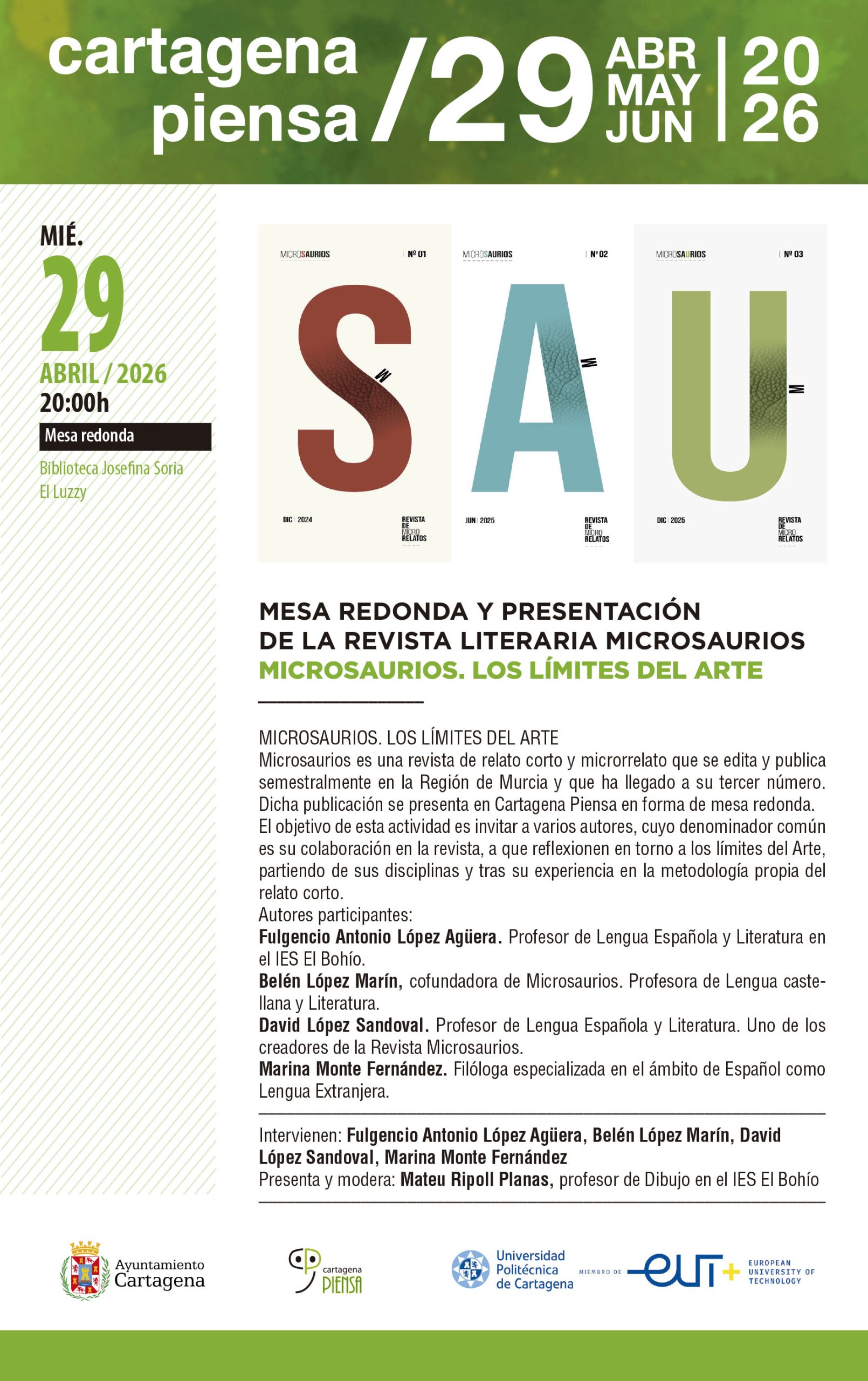 Microsaurios es una revista de relato corto y microrrelato que se edita y publica semestralmente en la Región de Murcia y que ha llegado a su tercer número. Dicha publicación se presenta en Cartagena Piensa en forma de mesa redonda.