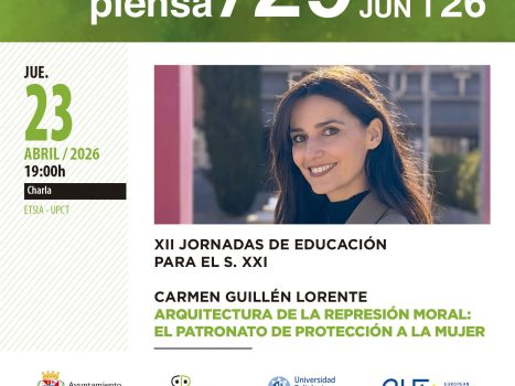 Jueves 23 de Abril. a las 19:00h Charla ETSIA. UPCT XII JORNADAS DE EDUCACIÓN PARA EL S. XXI CARMEN GUILLÉN LORENTE ARQUITECTURA DE LA REPRESIÓN MORAL: EL PATRONATO DE PROTECCIÓN A LA MUJER Presenta: Pepa Martínez Organiza: AFEREM Colabora: Cartagena Piensa Violencia, exilio, depuración de funcionariado o encarcelamientos. Estas fueron…